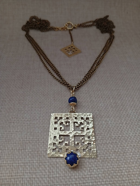 This piece completes the system. It condenses the entire sign into a single vertical form, crowned with a lapis lazuli stone whose deep blue shade evokes the traditional dark-blue color of Zmijanje embroidery. The stone is not a decorative accent but a bearer of color, memory, and continuity.
