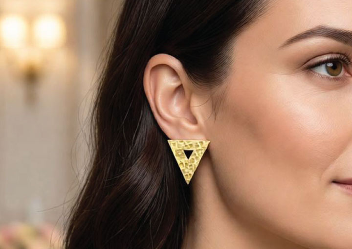 Add a touch of modern sophistication to your style with these striking triangular earrings inspired by earth symbol. Crafted with a unique textured finish and minimalist cut-out design, they’re the perfect accessory for those who dare to stand out. Lightweight yet impactful for day-to-night elegance.