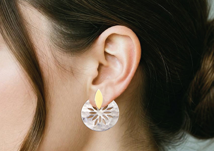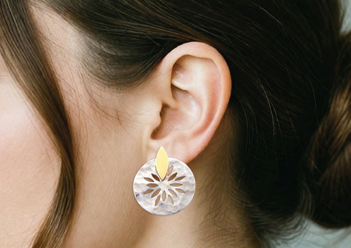 Inspired by the serene beauty of the lotus flower, these handcrafted ear jacket earrings blend artisanal texture with timeless elegance. The hammered zinc disc features an intricate floral cutout, symbol of awakening and returning to oneself, while a sleek gold-tone accent adds a modern twist. Lightweight, luminous, and effortlessly chic—these earrings are made to stand out, day or night.